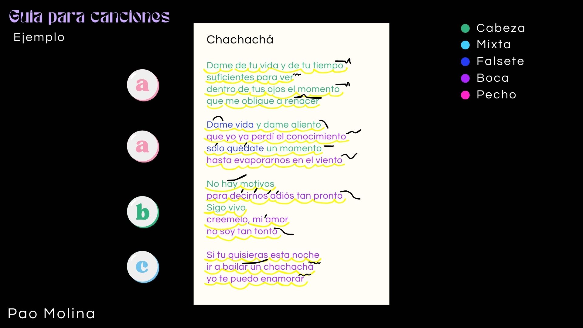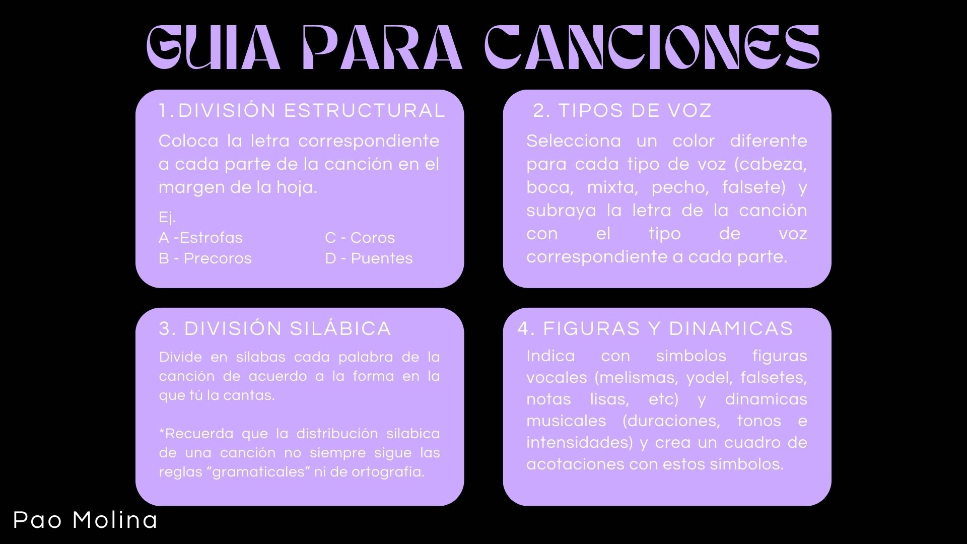 Las guías para canciones nos sirven para identificar y planear las secciones, los tipos de voz, figuras vocales, dinámicas musicales y distribución silábica de una canción para su ejecución.